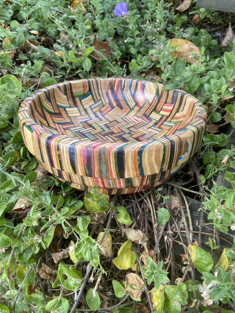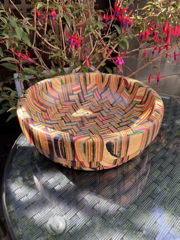Bring a unique, sustainable edge to your home with this handcrafted bowl made from broken skateboards. The herringbone pattern showcases a vibrant array of skateboard colours, making every bowl a distinctive work of art.