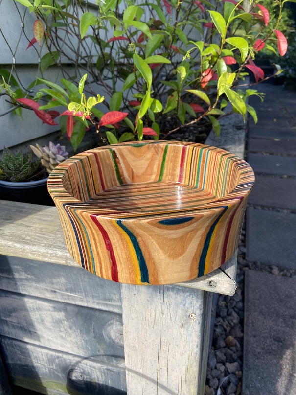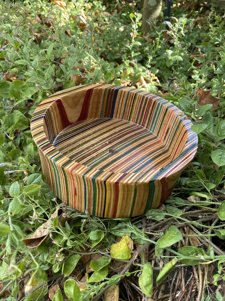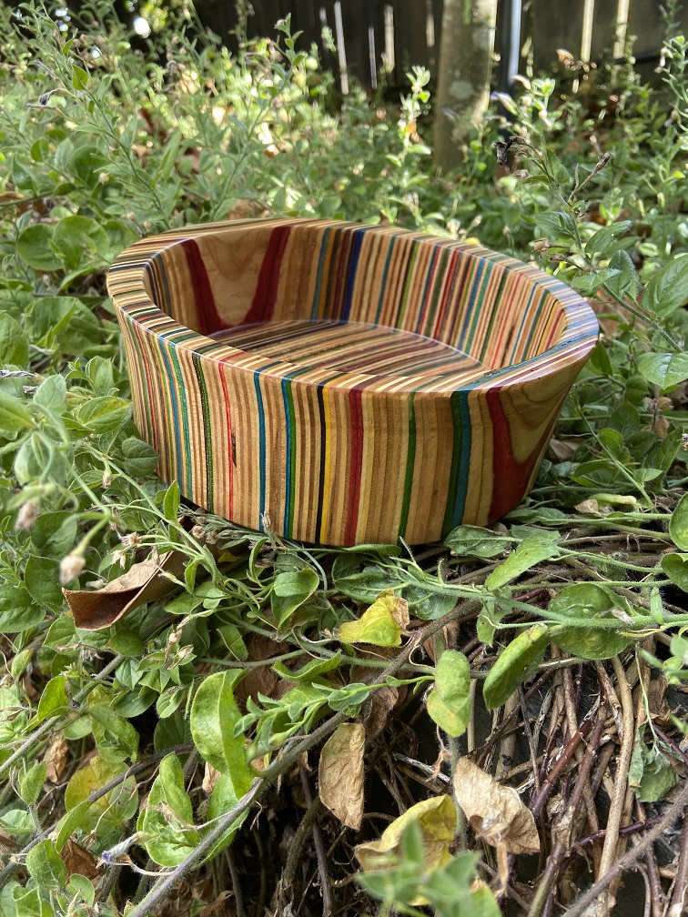 Bring a unique, sustainable edge to your home with this handcrafted bowl made from broken skateboards. The vertical plane layering of the wood showcases a vibrant array of skateboard colours, making every bowl a distinctive work of art.