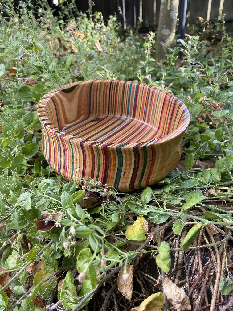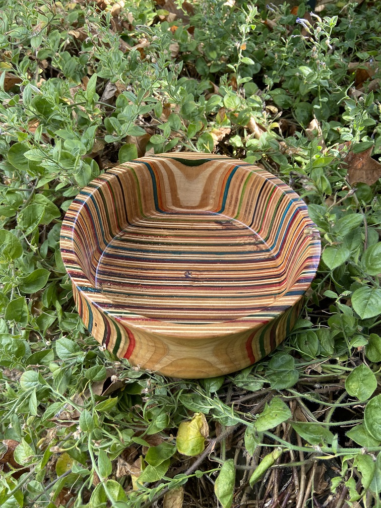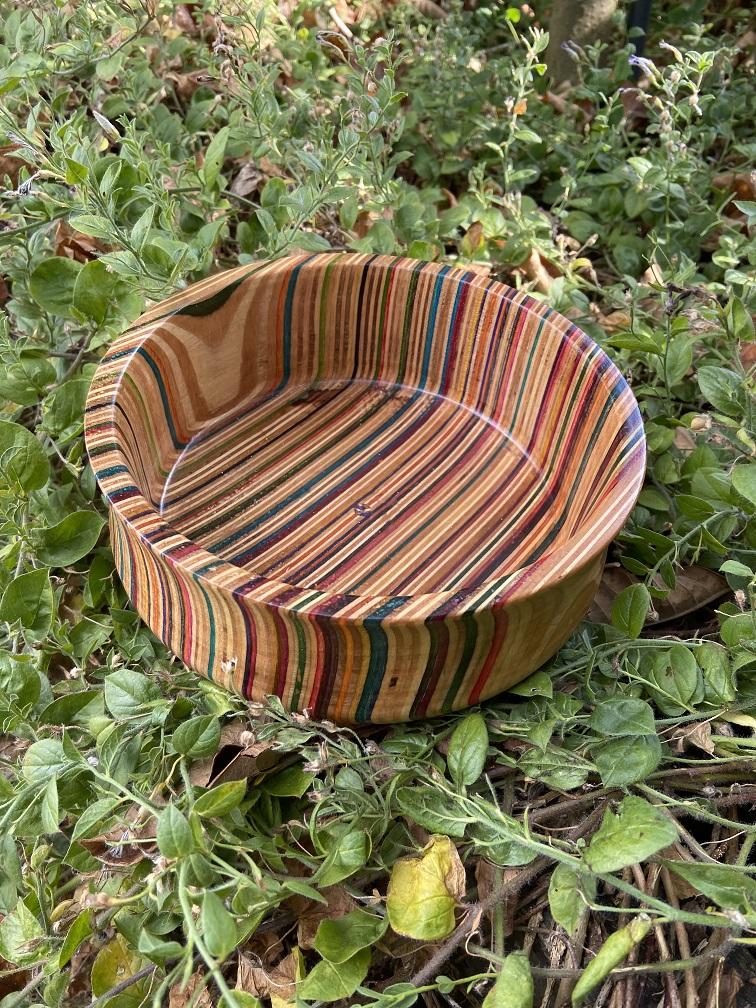 Bring a unique, sustainable edge to your home with this handcrafted bowl made from broken skateboards. The vertical plane layering of the wood showcases a vibrant array of skateboard colours, making every bowl a distinctive work of art.