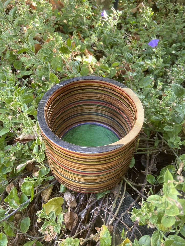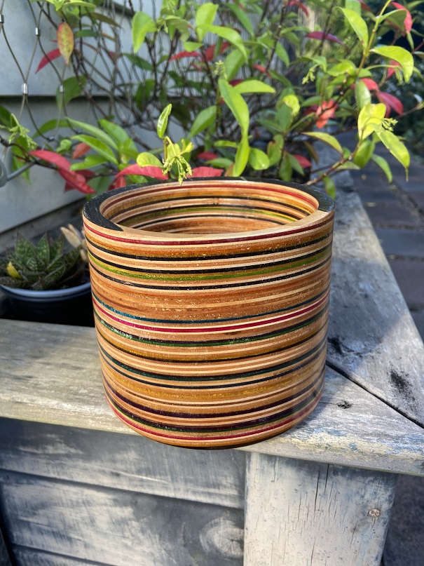 Bring a unique, sustainable edge to your home with this handcrafted bowl/pot made from broken skateboards. The horizontal plane layering of the wood showcases a vibrant array of skateboard colours, making every bowl a distinctive work of art.