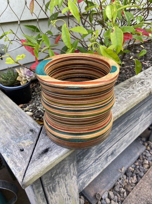 Bring a unique, sustainable edge to your home with this handcrafted bowl/pot made from broken skateboards. The horizontal plane layering of the wood showcases a vibrant array of skateboard colours, making this not just a bowl but a distinctive work of art.