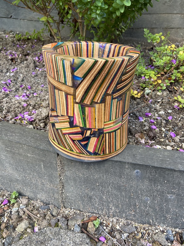 Bring a unique, sustainable edge to your home with this handcrafted vase / bowl made from broken skateboards. The arrangement of skateboard pieces to appear as books on a shelf showcases a vibrant array of skateboard colours, making a distinctive unique work of art.