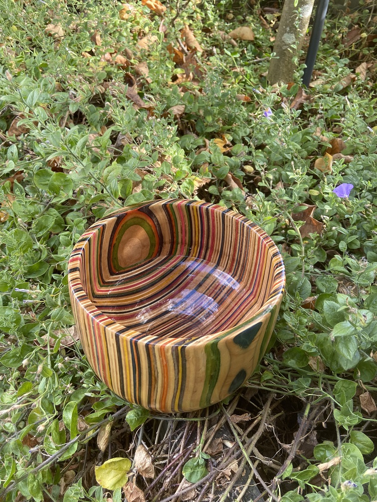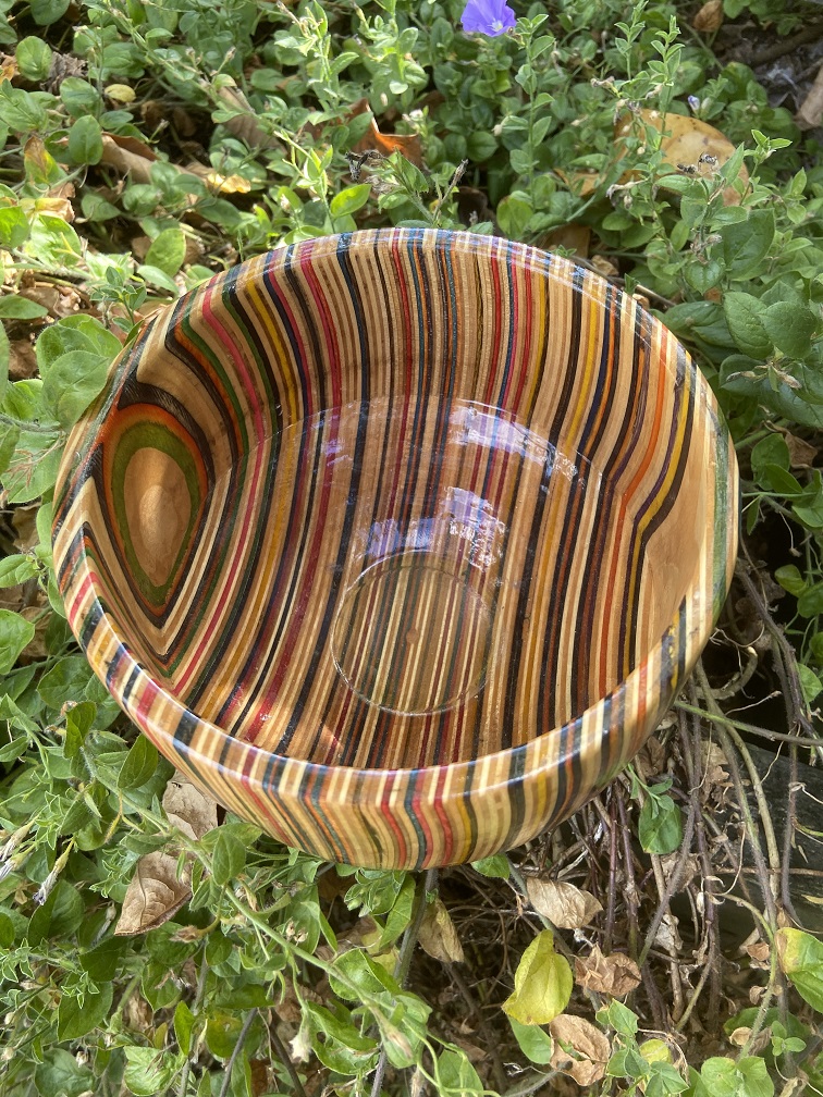 Bring a unique, sustainable edge to your home with this handcrafted bowl made from broken skateboards. The vertical plane layering of the wood showcases a vibrant array of skateboard colours, making every bowl a distinctive work of art.