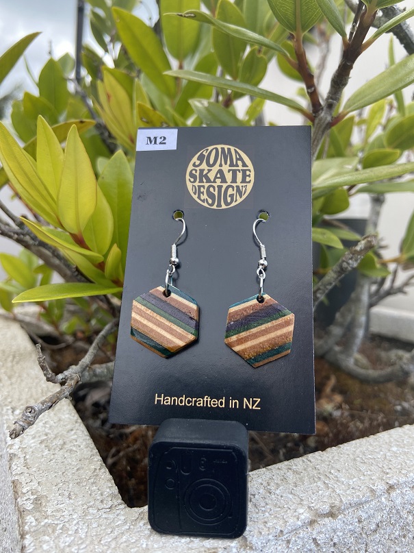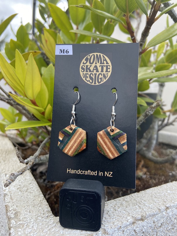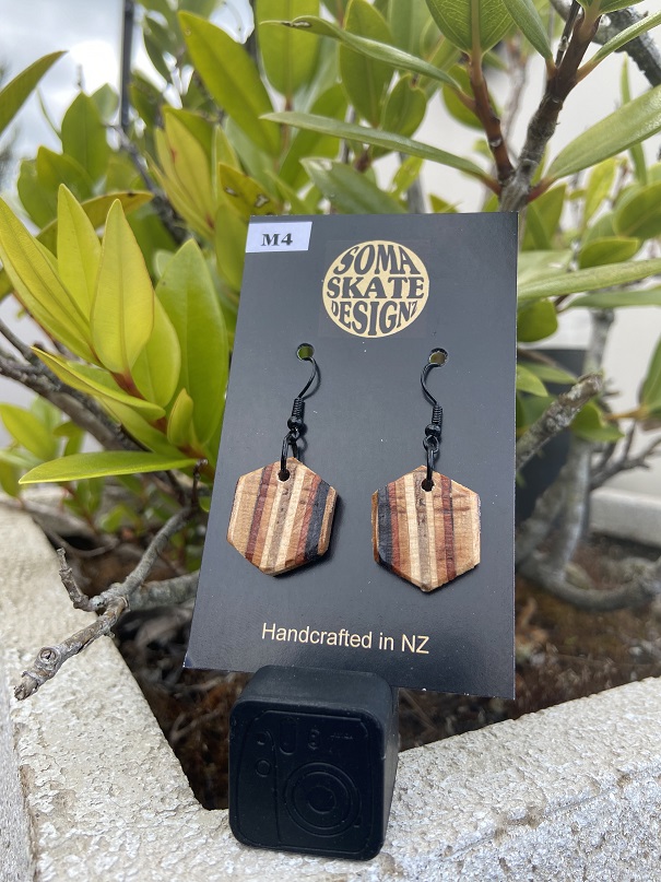 Unique hexagon shaped drop earrings from broken skateboards – hand made in NZ.