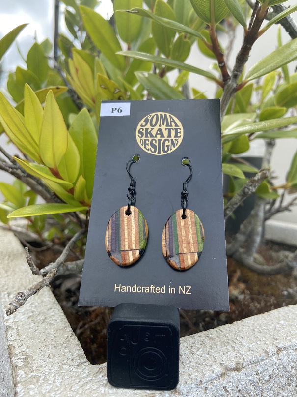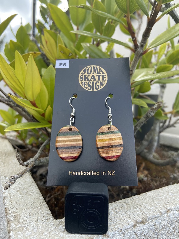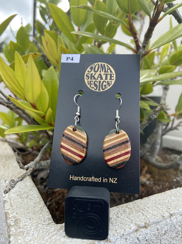 Unique oval shaped drop earrings made from broken skateboards – hand made in NZ.