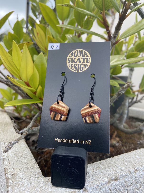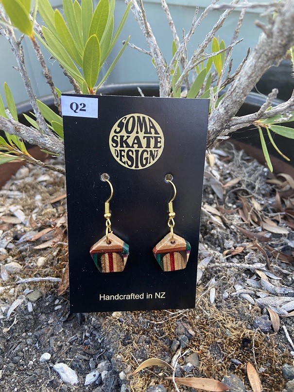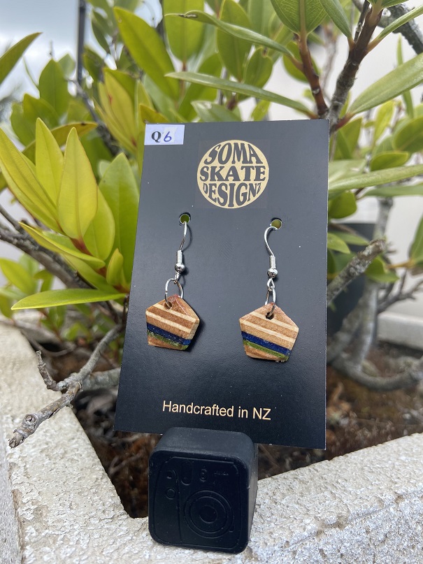 Unique pentagon shaped drop earrings from broken skateboards – hand made in NZ.
