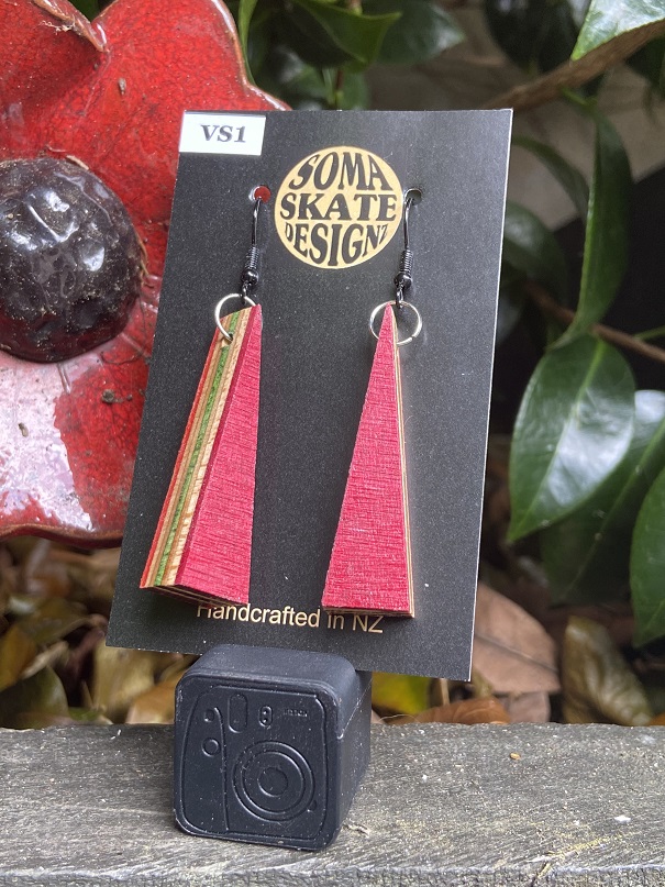 Unique xmas tree shaped drop earrings from broken skateboards – hand made in NZ.
