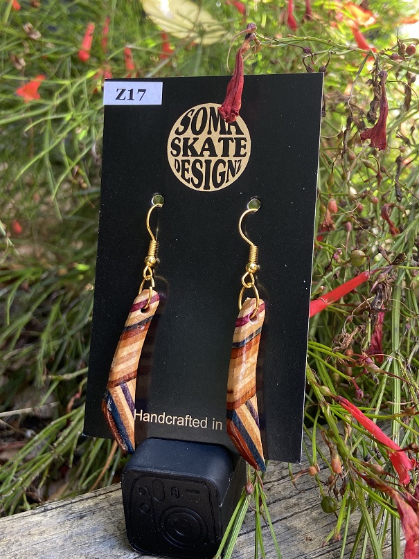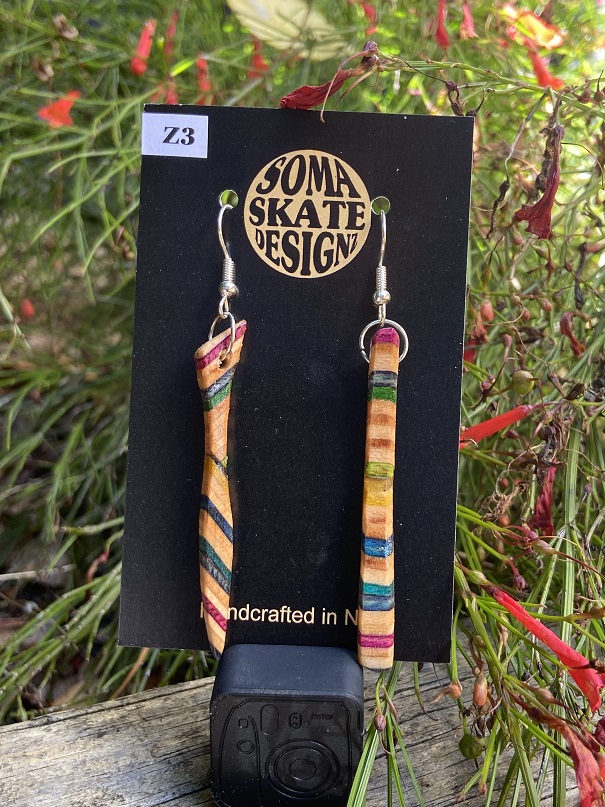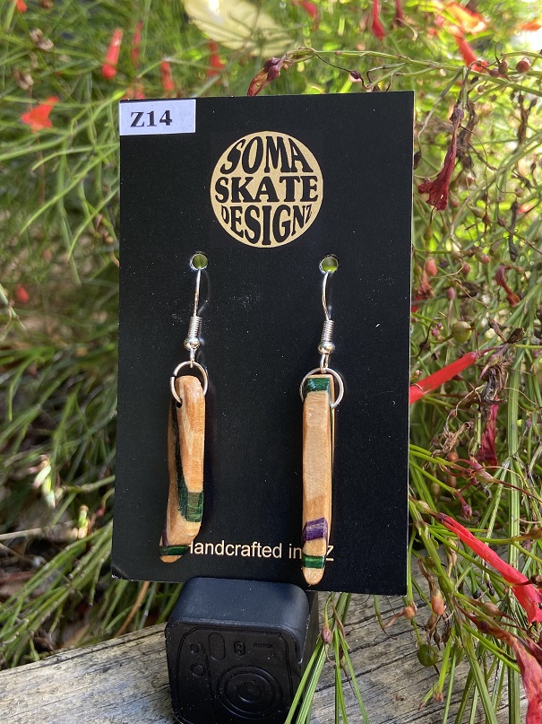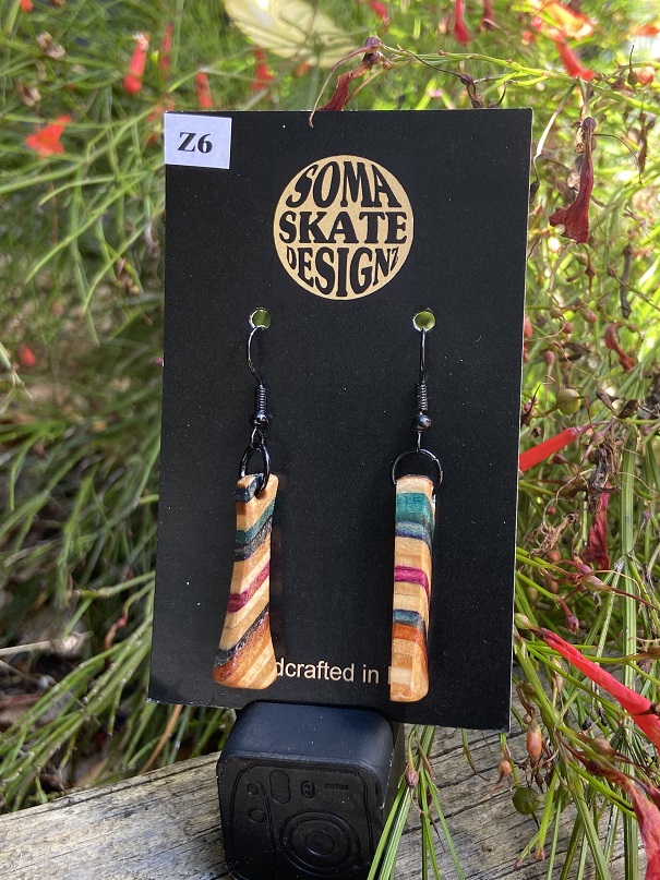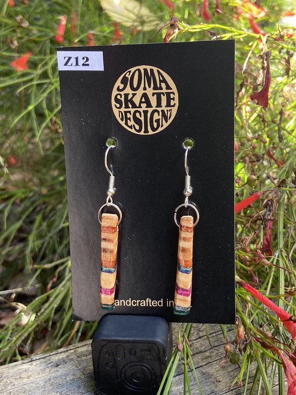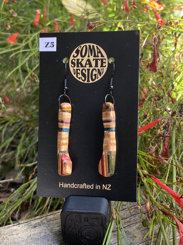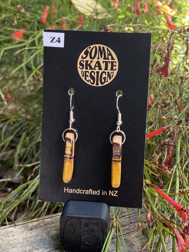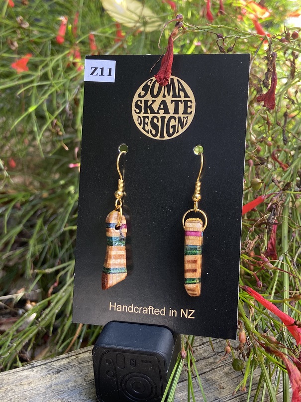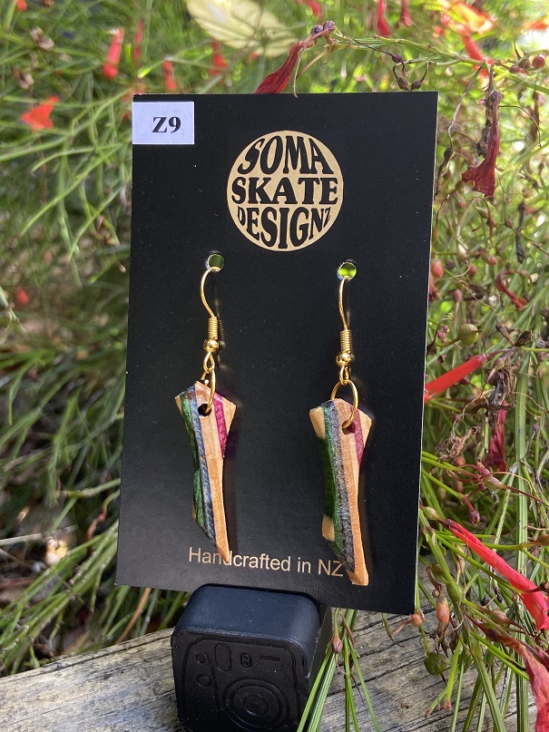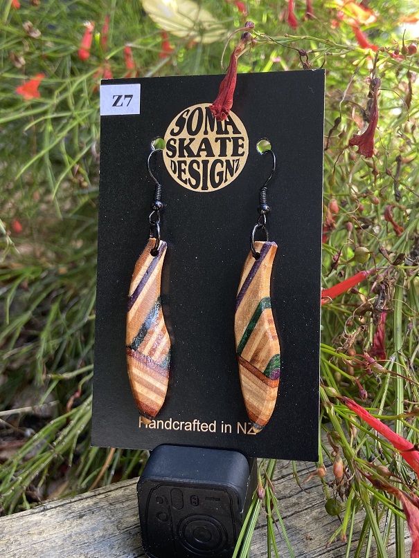 Unique random shaped drop earrings made from broken skateboards – hand made in NZ.
