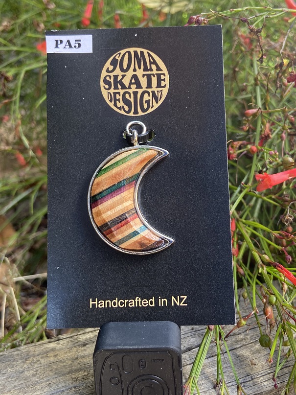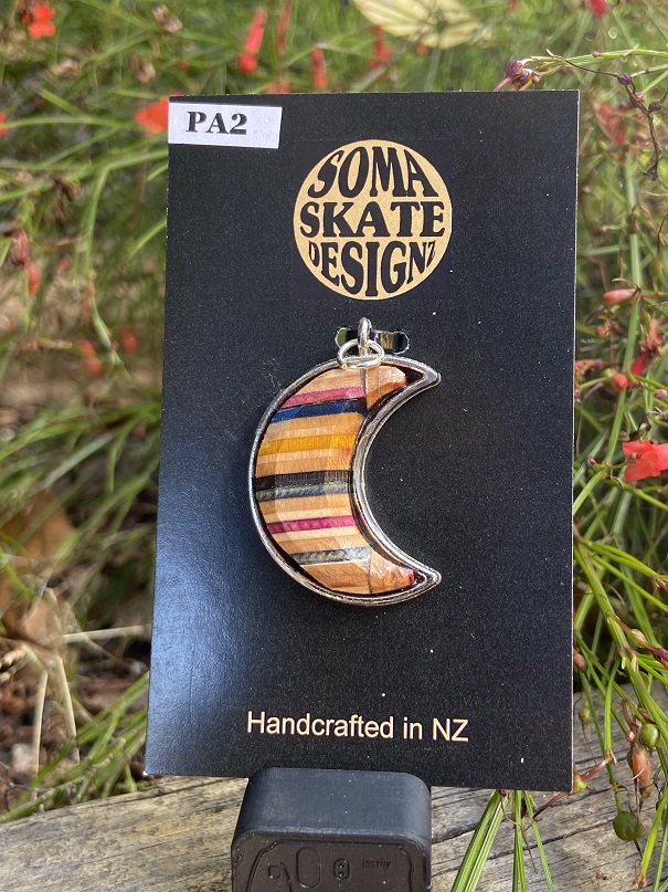 Unique cresent shaped pendants from broken skateboards – hand made in NZ.