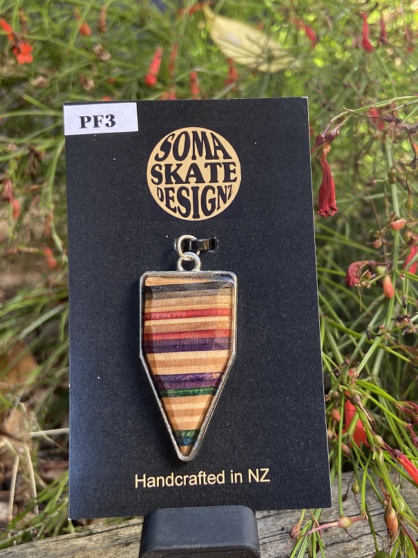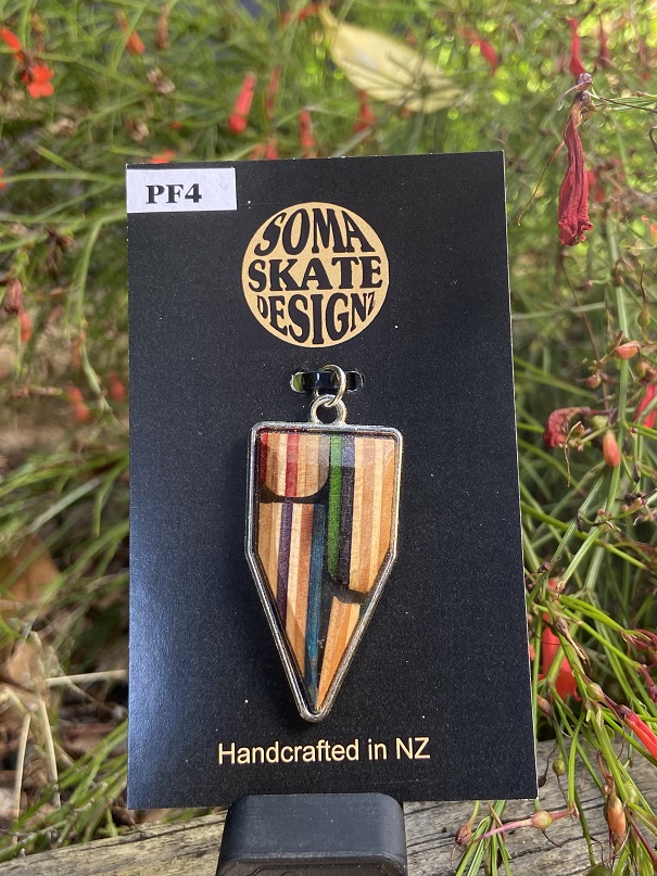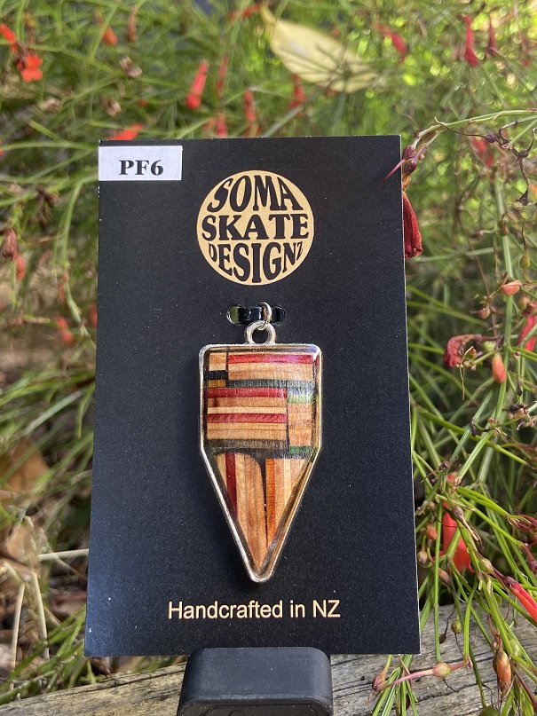 Unique inverted house shaped pendants from broken skateboards – hand made in NZ.