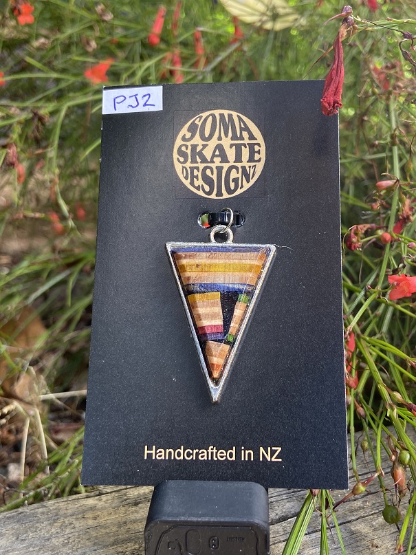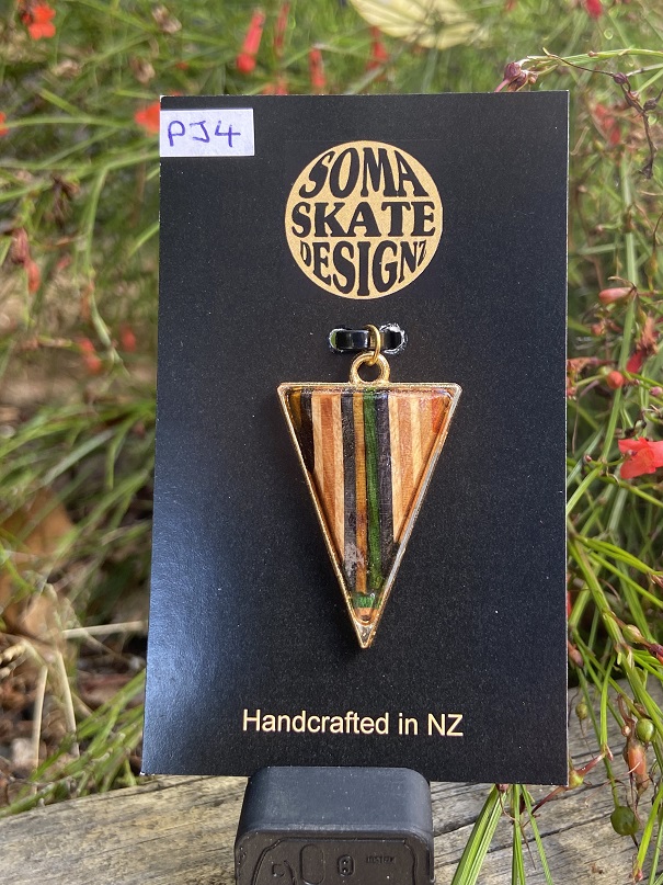 Unique triangle shaped pendants from broken skateboards – hand made in NZ.