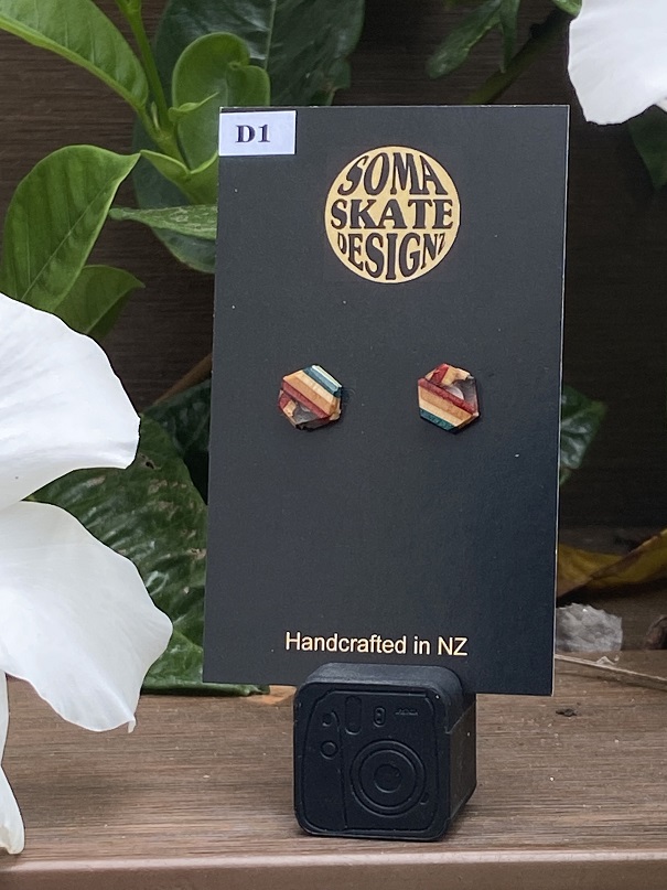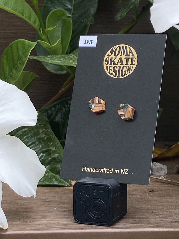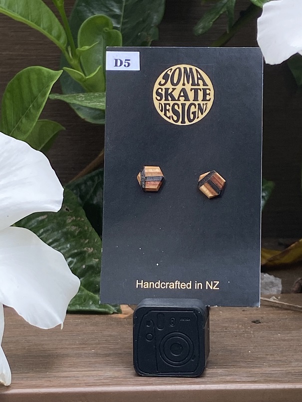 Unique hexagon shaped stud earrings from broken skateboards – hand made in NZ.