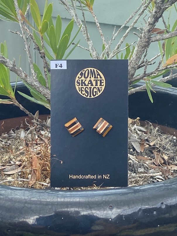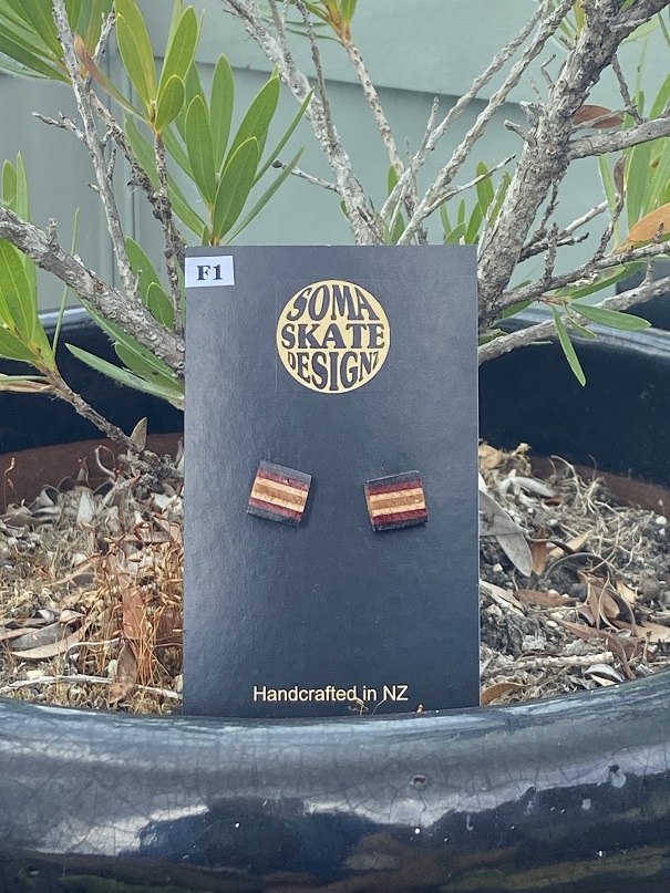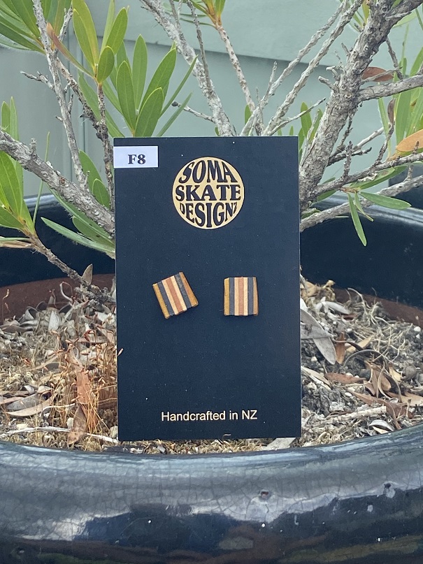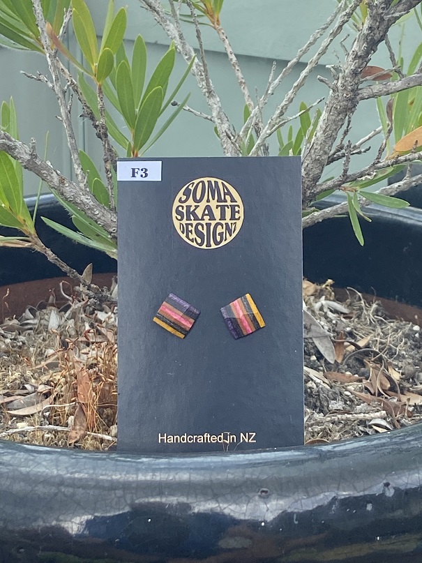 Unique square shaped stud earrings made from broken skateboards – hand made in NZ.
