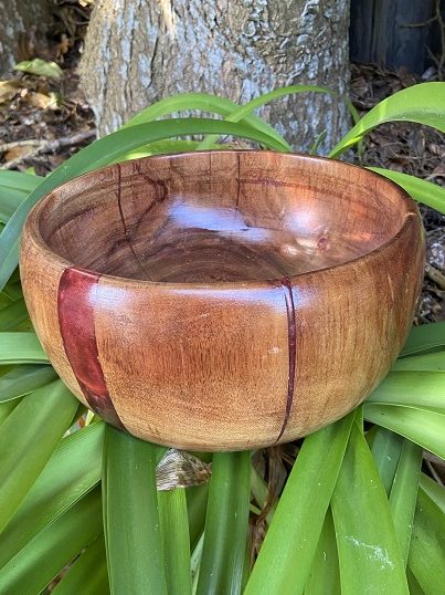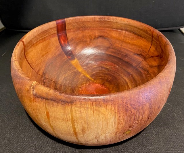 Bowl crafted from a discarded tree that was uprooted in a storm with red & gold resin highlights.