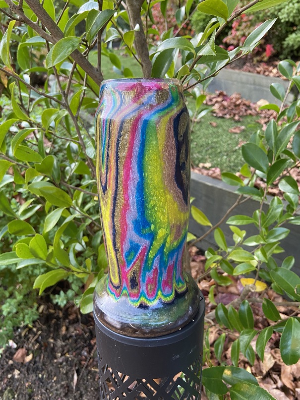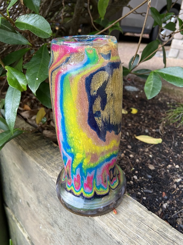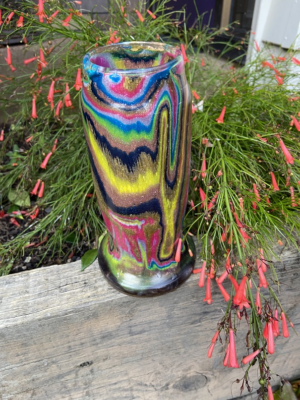 Bring a unique edge to your home with this handcrafted vase made from a crepe paper & resin. The contrasting vibrant colours in the paper give a unique and distinctive work of art.